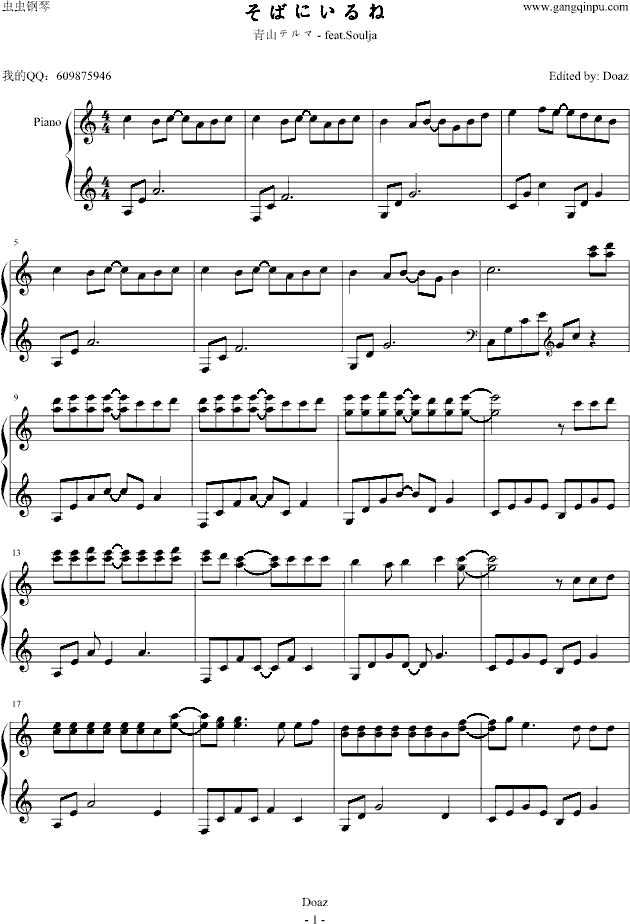 そばにいるね 青山テルマ 钢琴谱 五线谱